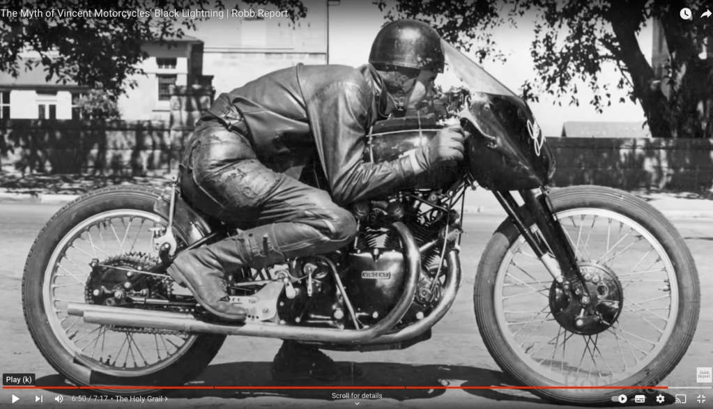 I’m sure none of the 13 musicians on my #1952VincentBlackLightning playlist are bikers. I don’t think the redoubtable Richard T rides bikes; Googling just brings up his YouTube performances of the song. It seems he knew that the Black Lightning – only 31 were made – was the fastest production motorcycle in the world in his 1950s childhood, and he took it from there. The ‘most famous picture in motorcycling’ is the ‘Bathing Suit Bike’; racer and obvious madman Rollie Free, lying prone and wearing nothing but his swimmers, breaking the USA Motorcycle Land Speed Record on a Black Lightning on Bonneville Salt Flats in 1948. 150mph! In 1948! Other image: Australian Jack Ehret, appropriately dressed, setting up to break the Oz motorcycle land speed record on a 51 Black Lightning in 1953.